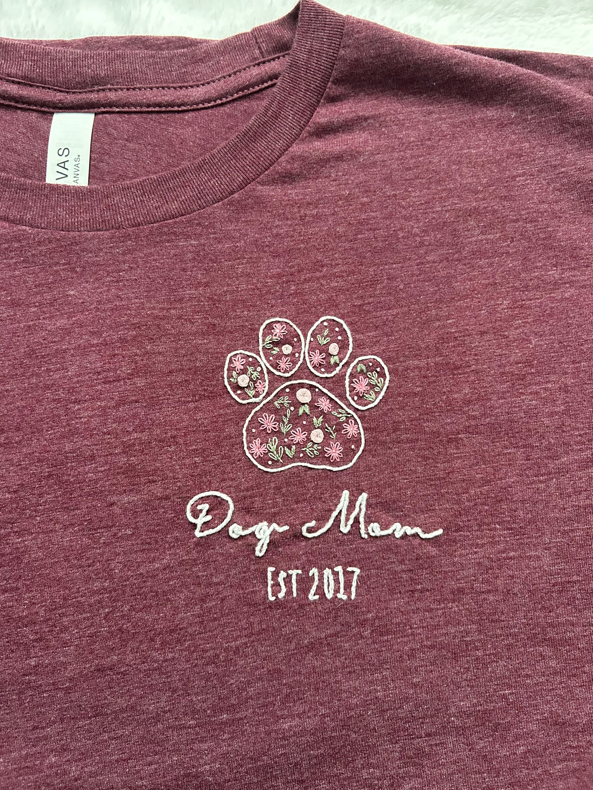Custom Hand Embroidered Dog Mom Shirt with Pawprint